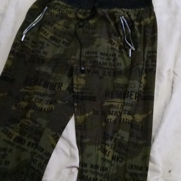Army patterned pants with words spreaded on it