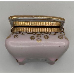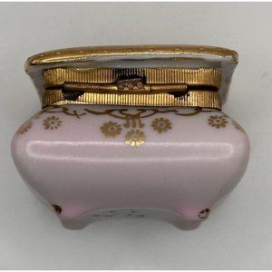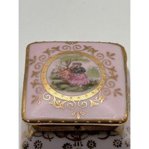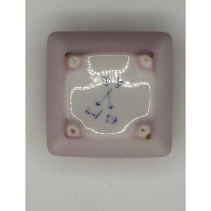 This lovely porcelain trinket box from Arnart Imports features a charming courting couple in delicate pink hues. The square shape and 1950s style give it a vintage feel that will add a touch of elegance to any collection. Handmade with care and attention to detail, this box is perfect for holding jewelry, keepsakes, or other small treasures. The material is high quality porcelain, and the country/region of manufacture is unknown. The box is in good condition and would make a great addition to any decorative collection. In very good condition.  Measures 2 inches wide.