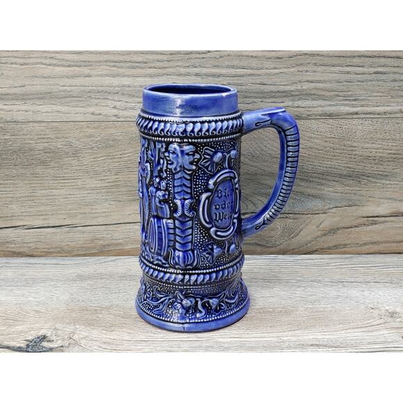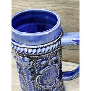Arnels German Beer Stein Blue 3D. Condition is used, Small Chip along top rim, see photo's. Measurements are 4" Wide at base, 7.5" Tall, Weight is 15.7oz.