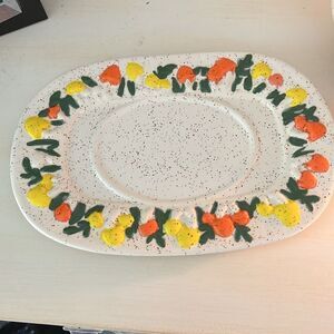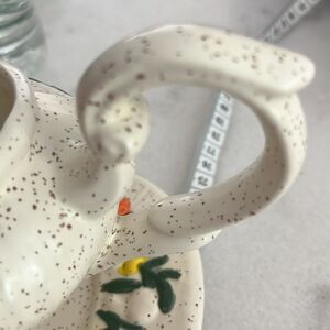 Charming gravy boat with vibrant mushroom design. Features bright yellow and orange flowers on a speckled tan background. Comes with a matching plate.