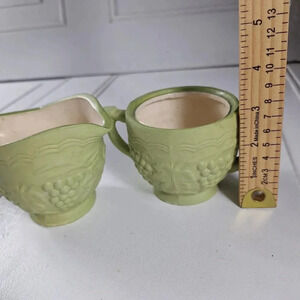 Arnels Vintage Creamer & Sugar Cup. Grape Design Green Pottery. Pre-Owned In Good Condition. Please See Pictures To See Actual Creamer and Sugar Cup Condition and Measurements. No Lid On Sugar Cup/ Missing Lid. Please See Pictures to See Creamer and Little Imperfection on Bottom of Creamer. Please Reach Out With Any Questions! Have a fabulous Day!