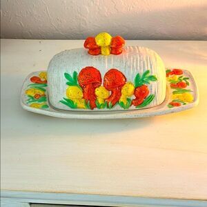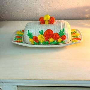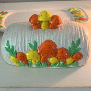 Arnels Vintage Covered Ceramic Butter Dish with Mushrooms Yellow /Orange RARE