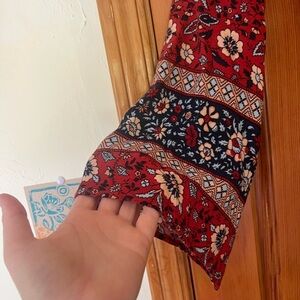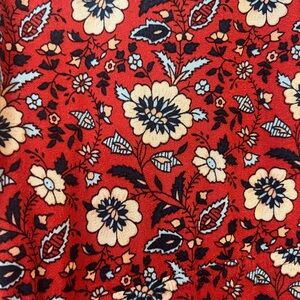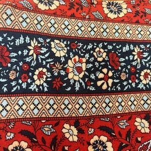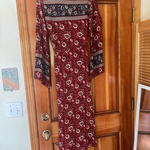 Elegant bohemian maxi dress with a vibrant red floral pattern. Features intricate designs and long sleeves. Missing one small button but can’t tell because it’s where the tie is