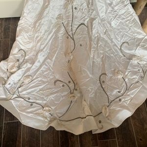 @maylisatkins I finally just posted a picture of the label. I cannot find the tag with fabric content. It must be buried in the skirt somewhere. It’s satin and has been dry cleaned one time after being worn. It is a stunning down and I also have a matching head piece with a veil that trains way down the back that I would throw in if you want to purchase the dress