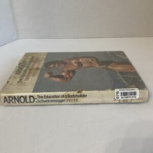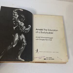 The product is a hardcover book titled "Arnold: The Education of a Bodybuilder" by Arnold Schwarzenegger and Douglas K. Hall. Published in 1977 by Simon & Schuster, this vintage nonfiction book is intended for adult readers and features illustrations. The book, ex libris with a dust jacket, covers topics related to exercise and health, making it a valuable addition to the genres of biography, entertainment, and fitness.