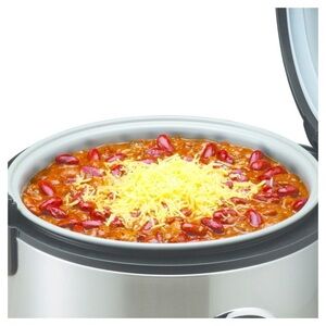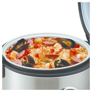 Aroma rice cooker in sleek black and silver. Perfect for cooking rice effortlessly. Easily prepare up to 8 cups of cooked rice in this Aroma Rice Cooker. Made of stainless steel with a brushed finish and a cool touch exterior. The cooker has an removable non stick cooking pot and a lid, making cleaning up easy. Includes a steam tray, serving spatula, rice measuring cup and instruction manual. Features a locking lid, keep warm function, condensation collector. Great for rice, chili or soups! NIB