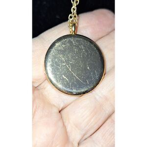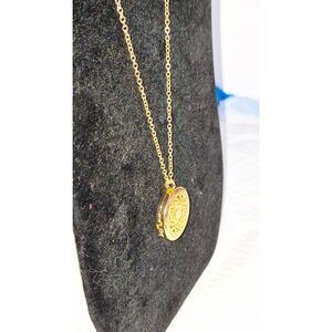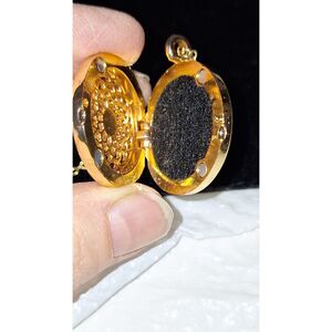 This is an essential oil diffuser locket necklace. It has a pierced mandalla design on the front to let the scent escape. It has a magnetic closure and a very nice high gold tone on the locket and necklace. This is a very elegant looking piece and could be worn with just about anything. It is about 22" long and in nice pre-owned condition. This one does have a felt pad in it that does not come out. You can probably put others on top of it.