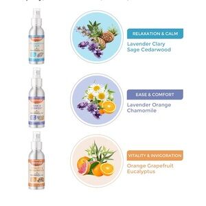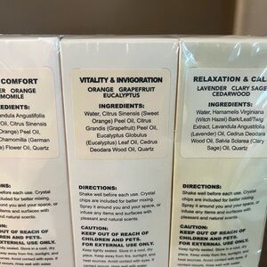 Experience the refreshing scent of Aromatherapy Mist. Perfect for body, room, and linen, this mist is crafted with pure essential oils. Enjoy the three different invigorating aromas. The relaxation & calm mist may have leaked (in its original package) so price adjusted accordingly.