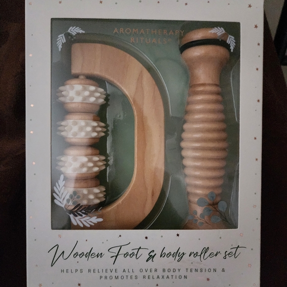 NWT Aromatherapy Rituals Wooden Foot and body roller set. Helps relieve all over tension and promotes relaxation.