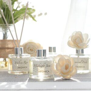 Aronica Mini Flower and Reed Diffuser in the "Midnight Jasmine" scent with orange, cedarwood, vanilla and jasmine notes; includes 1 diffuser glass (1.4 Fl Oz /40ml), 3 natural wood reed sticks and 1 handmade sola flower - size is approximately : 12 x 6 x 4 inches; typically lasts for 60–90 days, depending on the climate; Cruelty-free formulas, Paraben-free ingredients, Nature-inspired materials; BRAND NEW IN BOX AND SEALED-makes a great gift for YOU or someone else. Free Gift Wrapping if sending as a gift (just send me a message and let me know). AN EXCELLENT VALUE FOR A QUALITY PRODUCT!!