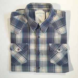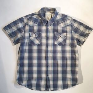 100% cotton plaid short sleeve button-down with western-style front shoulder details and pockets with snap buttons.