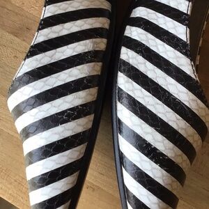 Aerosoles “Hey Girl “ flats size 9w. Black and white striped snake skin print. Leather uppers and rubber outsoles. Average used condition. Very slight blemishes on right toe and toe box sides. Please see photos.
