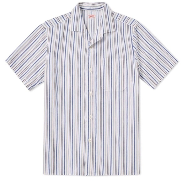 this summer ready camp collar shirt is made from an airy cotton / linen blend fabric (63% Cotton, 23% Polyester, 14% Linen) in white with mainly blue stripes, but also a little bit of orange stripe in there as well. cut with a wide and modern shape & a straight hem, it may look relaxed, but it has been designed as a true luxury garment with tight French seams. it fastens with large, creamy, authentic mother of pearl buttons from Vietnam. this shirt is finished with a chest patch pocket & a convertible collar. made in France, men’s size medium.