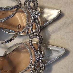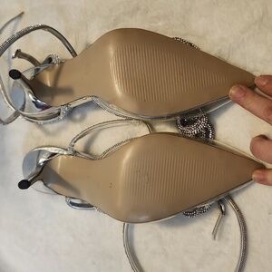 Step out in style with these elegant silver heels. Perfect for any occasion, these shoes add a touch of glamour to your outfit. EUC. worn once. very clean. minimal sole wear. straps climb up your leg