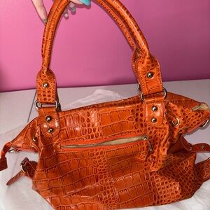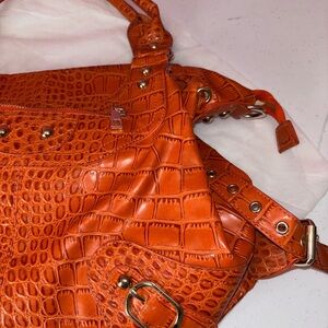 The Array shoulder bag in a striking orange hue is crafted with a textured design that mimics exotic leather patterns. Its spacious interior and decorative tassel make it a stylish and functional accessory for any occasion.