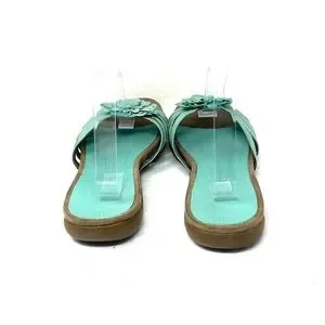 Array teal leather flower slide sandals. Women's size 10.5. A few marks and signs of wear (see photos). In good pre-owned condition. Box not included.
