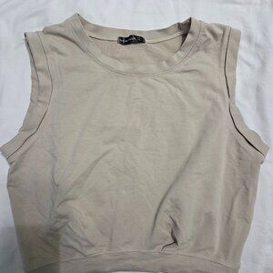Arrive Guide tank top, beige, size Large, made in China, sleeveless, cropped, round neck, 94% cotton, 6% Spandex, machine wash, measures 19" armpit to armpit, 18" top to bottom.