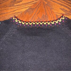 Gorgeous vintage sweater by Arriviste. Black knit with brightly colored animals embroidered across the chest and shoulders. Very tropical bright colors and beautiful beadwork. Colorful embroidery and beading also at the cuffs and necklines. Very good preowned vintage condition. Maybe slight pilling on some of the felt animals and a couple threads that are starting to loosen but I have not noticed any missing beads. No holes or tears and smoke free. Women’s size small. The model usually wears a size medium so this may run large and will fit differently on other frames. 18.5 inches pit to pit laid flat. 21 inches shoulder to bottom hem. Sleeve is 18.5 inches from armpit to cuff.