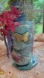 This decorative glass whiskey bottle measures 3.5" wide by 10" high and has been artfully altered with chalk and metallic paint. It features vintage or recycled jewelry, silk ribbon, rhinestone chain, dried moss, and a large chunk of raw amethyst as a topper. A magical dragonfly and flowers are decoupaged as the focal point.