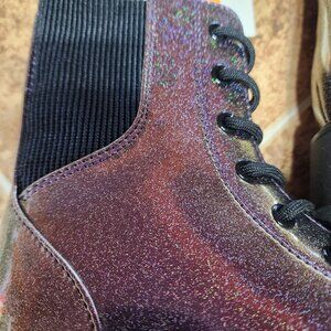 These punk rock purple/green shift glitter boots are made for stomping! Never worn, new with tags. Chelsea style boots with an inside zipper for easy on and off.