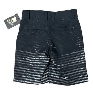 NWT Boys Art Class Striped Hybrid Swim Trunks. Size 5. Button & Velcro closure with adjustable waist. Mid-rise cut and at-knee length with side and back pockets. Color is black.