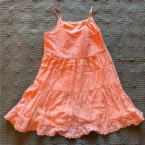 Adorable peach dress with eyelet details. Features spaghetti straps and tiered design. Perfect for casual outings.