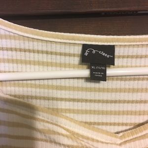 This a super cute cream dress with metallic gold stripes. It’s a girls XL but would fit a women’s small or medium too! It’s a ribbed material, super soft and comfortable.