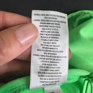The lime green one-piece swimsuit features a cutout design with adjustable spaghetti straps. Good pre-owned condition, some very light pilling throughout.
