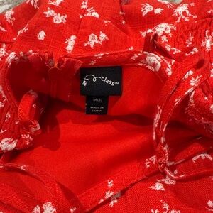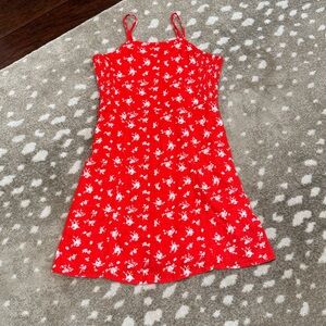 Bright red dress featuring a delicate white floral pattern. Never worn but tags removed.