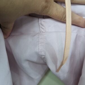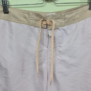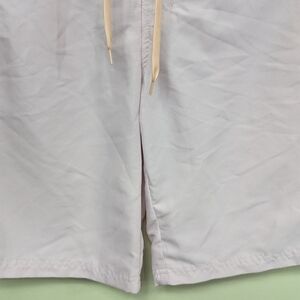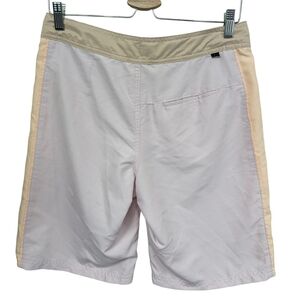These shorts are in gently used condition. These shorts are a lightweight recycled polyester material. They have a brushed texture. The inside has a mesh lining. The waist has a tie and a hook and loop fastener. The waist has elastic tabs that can be tightened for a better fit. They also have a mesh lined back pocket.