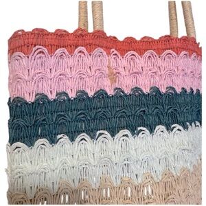 Chic and versatile multicolor striped tote bag perfect for any occasion. Features a stylish blend of pink, green, cream, and tan hues. Ideal for adding a pop of color to your outfit.