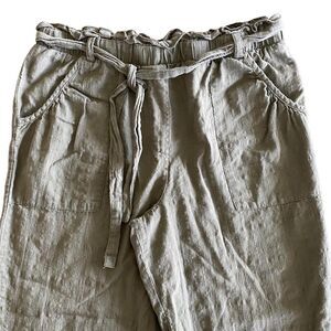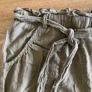 Pull-on style, elastic waistband with ruffle edge, removable tie waist sash/belt, two front pockets, elastic jogger hem, olive green fabric with checkered texture pattern.