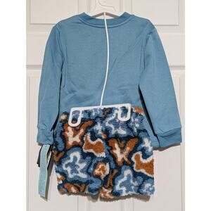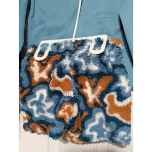 Colors: Blue top; multicolor plush shorts in blue/white/rust pattern