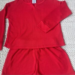This Art Class Red Ribbed Girl's Pajama Set Size Small showcases a striking red hue, crafted from soft polyester for ultimate comfort—the long-sleeved top pairs perfectly with matching shorts, offering a timeless design ideal for cozy indoor wear. Experience a blend of style and relaxation with this classic pajama set. It is gently used but in excellent condition.