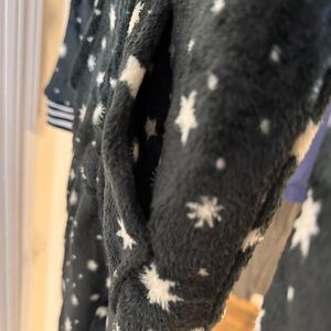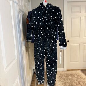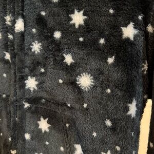 Art Class cozy fleece onesie with hoodie, star pattern. Features black and white colors. Perfect for lounging. Perfect for those cool summer nights when you are camping. Flame Resistant. 100% Polyester, hood lining 100% Polyester Size 4/5 Toddler
