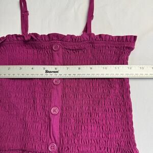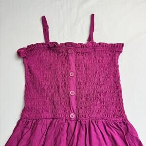 This is an Art Class brand dress, new with tags. The dress is a size XL (14/16) and is made of 80% rayon and 20% linen. The lining is 50% recycled polyester and 50% polyester. The elastic is 62% polyester and 38% spandex. The dress is a solid magenta color with a smocked bodice and adjustable straps. It features a ruffled neckline and a button-down front. The dress is in new condition with no visible imperfections.