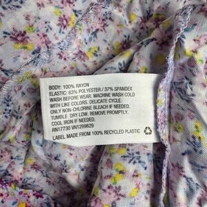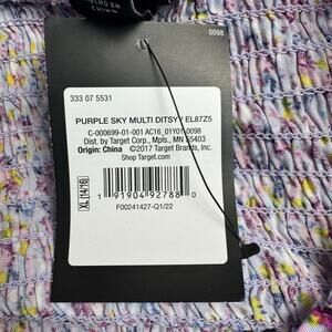 This is an Art Class dress, size XL (14/16), in new condition with tags. The dress features a purple sky multi ditsy floral pattern. It has a smocked bodice with adjustable straps and decorative buttons down the front. The material is 100% rayon, with elastic made of 63% polyester and 37% spandex. The dress is free of any visible imperfections.