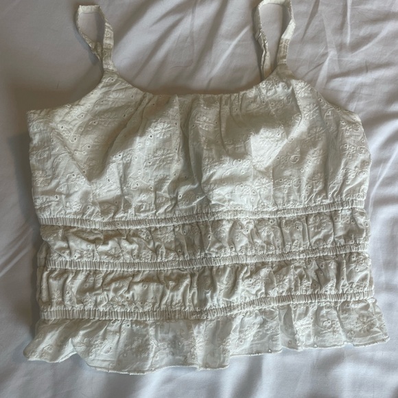 This elegant white camisole from Art Class features a sleeveless design with delicate ruching and ruffled details. The smocked bodice adds a touch of texture, while the lightweight fabric ensures comfort and style. Perfect for layering or wearing on its own, this top is a versatile addition to any wardrobe.