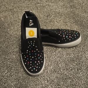 Chic black sneakers with vibrant multicolor studs. Easy slip-on style. Perfect for casual wear.