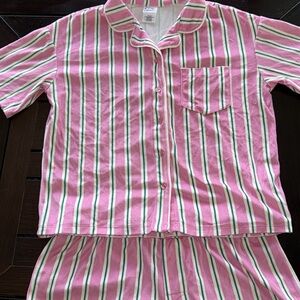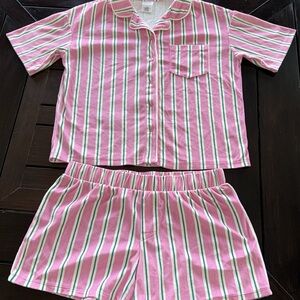 Cozy and stylish striped pink pajamas size Girls XL also fits a Woman small. Approximate measurements in photos. Stretchy material. Perfect for a comfortable night's sleep. Worn once.