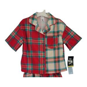 A delightful pajama set designed for children, featuring a charming plaid pattern with a festive touch. This set includes a button-down shirt and coordinating shorts, crafted from recycled polyester for comfort and sustainability. Flame-resistant properties ensure safety during sleep, while the vibrant red and green colors add a cheerful vibe to bedtime routines. NWT