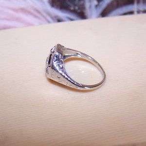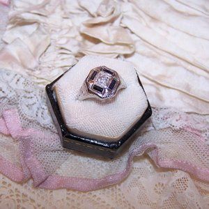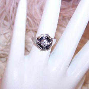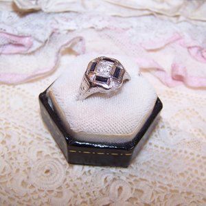 There's nothing quite like an Art Deco (C.1920/1930 or so) ring! Measuring a size 4.25 on my ring sizer, this 14K White Gold (tested, not marked) beauty features a faceted round diamond (tested) at the center of 4 dark blue sapphire (possibly synthetic but entirely period appropriate and original to the design) baguettes. To complete the design, there is engraving on both shanks, under the stone setting and on he top. The center diamond (graded G-H color with SI1 clarity) measures 4mm approx (25 points) while the sapphires measure 3.5mm x 1.5mm (about 8 points each) for a total gemstone weight to the ring of .57CT TW approx. Design on top measures 7/16" x 7/16"; weight is 2.2 grams. All the gemstones are set with an open back so when the light hits the ring, the clarity and sparkle of the stones is amazing. Just a lovely ring for the lady who has a small finger size.