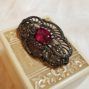 Lovely Art Deco 1930s Sterling Silver filigree Brooch featuring a synthetic Ruby and Marcasites. As you can see in the pictures, this pretty Brooch is a Stunner! Measures 2" x 1.25". A wonderful addition to your Heirloom Quality Jewelry wardrobe.