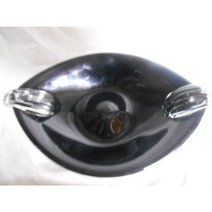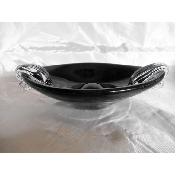 Art Deco Black Glass Trinket Bowl with Clear Swirled Handles Handcrafted