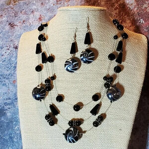 Art Deco Black Jet AB Czech Glass Baubles Multi Strand Necklace Earrings Set