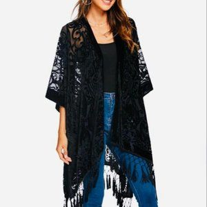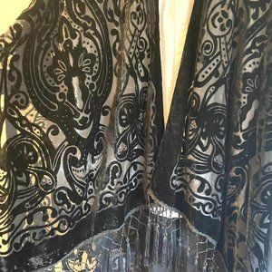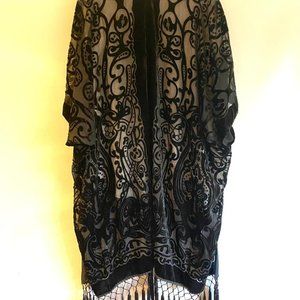 Black Velvet Kimono art deco Design, semi sheer with velvet, beautiful fringe