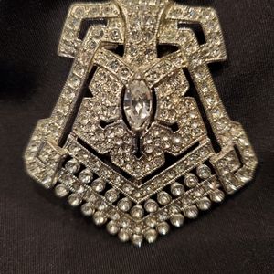 1940s Art Deco Rhinestone Brooch- Clip style. Beautiful center marquee style cut Rhinestone with over 180 round cut Rhinestones. Sterling silver setting in very good condition.