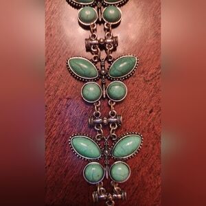 Art Deco Butterfly Bracelet. Excellent condition. Toggle closure. Silver-tone link bracelet adorned with multiple green, cabochon-cut stones arranged in a distinctive butterfly motif, possibly featuring turquoise or a similar gemstone like malachite or howlite. Design: The bracelet is composed of interconnected links, with each segment showcasing a butterfly shape formed by the arrangement of the green stones.