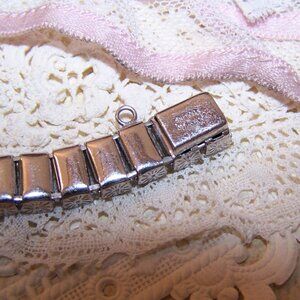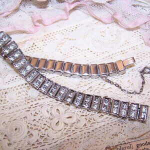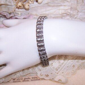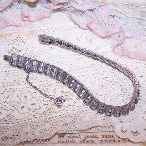 Dating around the 1940s or so, may I offer this Sterling Silver (hallmarked as pictured with CATAMOR) line bracelet - tennis bracelet filled with clear glass rhinestone pastes. Crafted by Catamor, the length is a bit over 7" long making for a 7" wearable length; width is 5/16". Weight is 18.2 grams. Tongue in closure with a spring catch safety for added security. Lovely condition with the stones still full of sparkle. Very shiny finish due, no doubt, to a rhodium overlay. A great starter piece for a bracelet stack! Oh, and I do have the matching necklace - I will try to get that up as soon as I can.