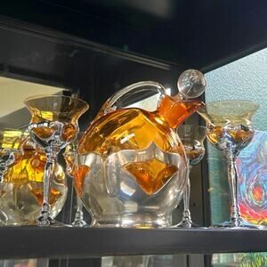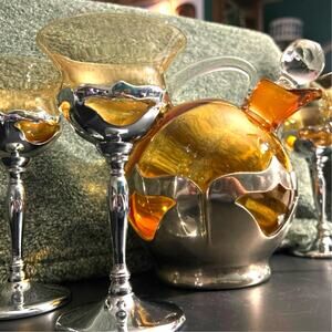 This beautiful set combines amber glass components with chrome metal bases and accents. The goblets can be separated, carefully, to clean glass or chrome. No chips, cracks, repairs to glass. Not sure about the decanter. Always open to considering reasonable offers.